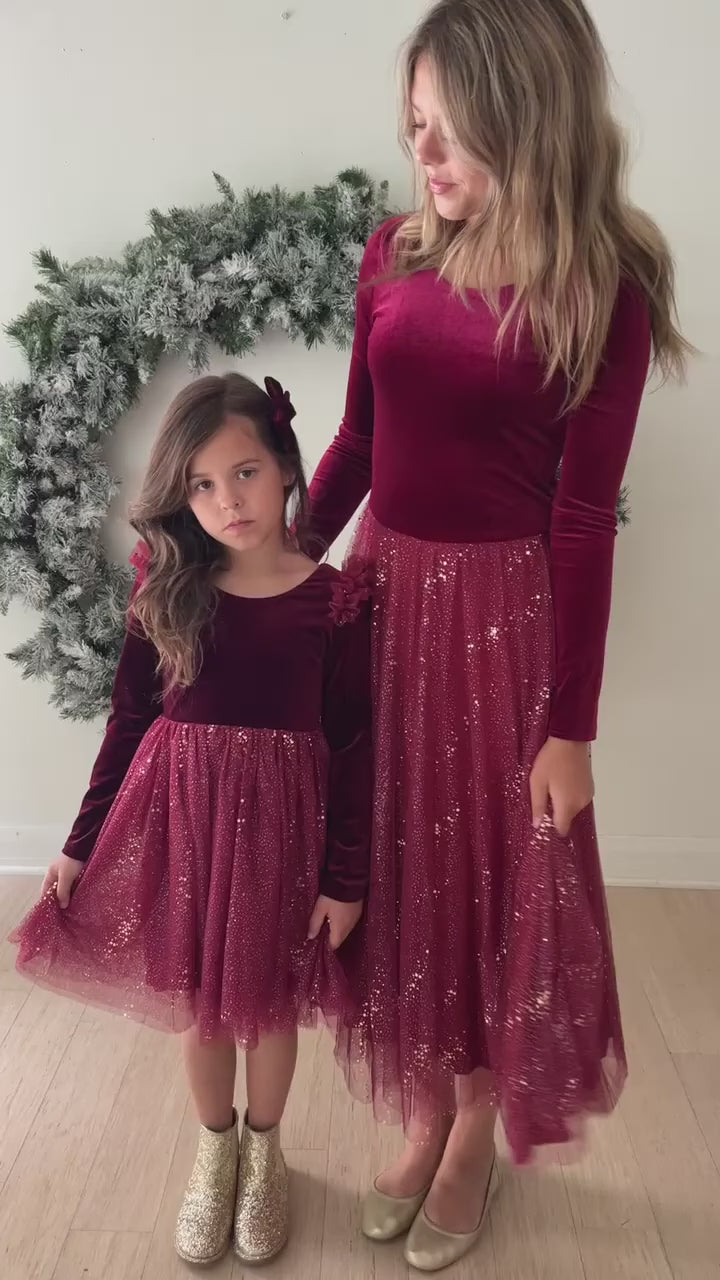 This season, we've brought back a fan-favorite: Red Velvet - a rich shade of crimson in the most luxurious stretch velvet for women! It pairs perfectly with our little ones' ballerina dress and velvet hair bow, and is lined with an ultra-soft bamboo viscose knit in the body and skirt. Two layers of delicate tulle shimmer with every step. This dress is a must-have for your holiday wardrobe and will be a go-to for years to come.